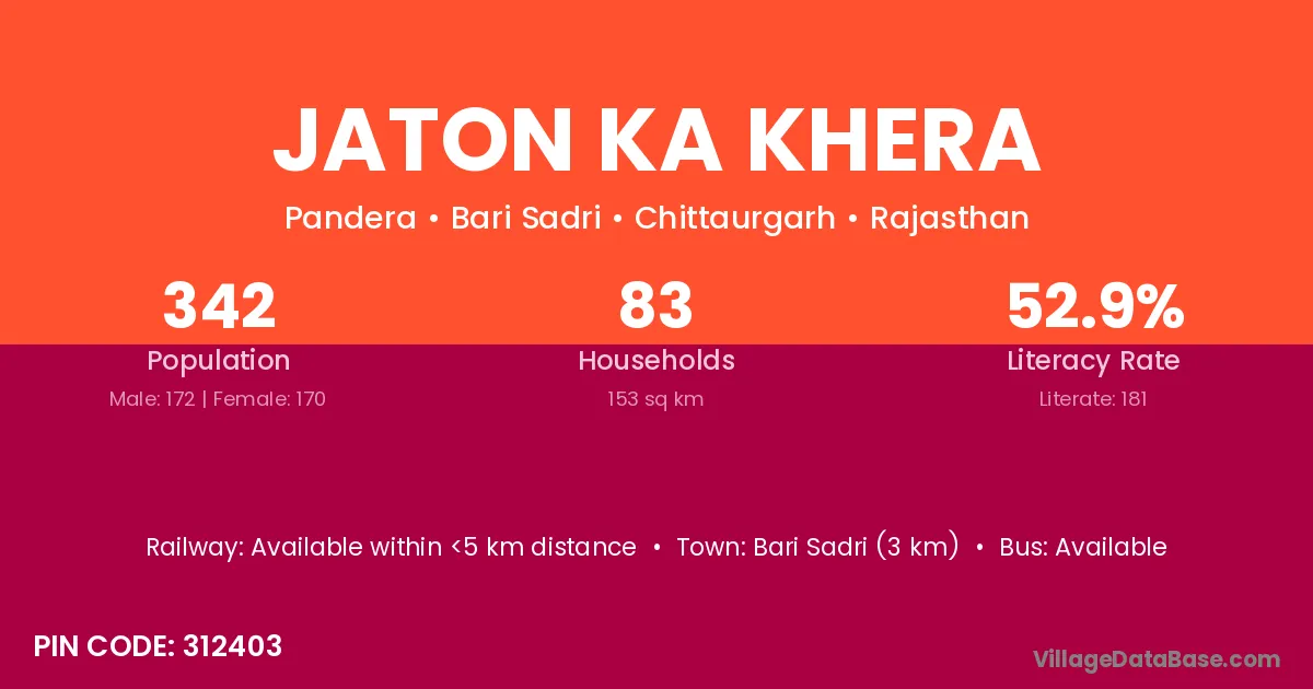 Jaton Ka Khera village has a total population of 342 people, of which 172 are males and 170 are females.
