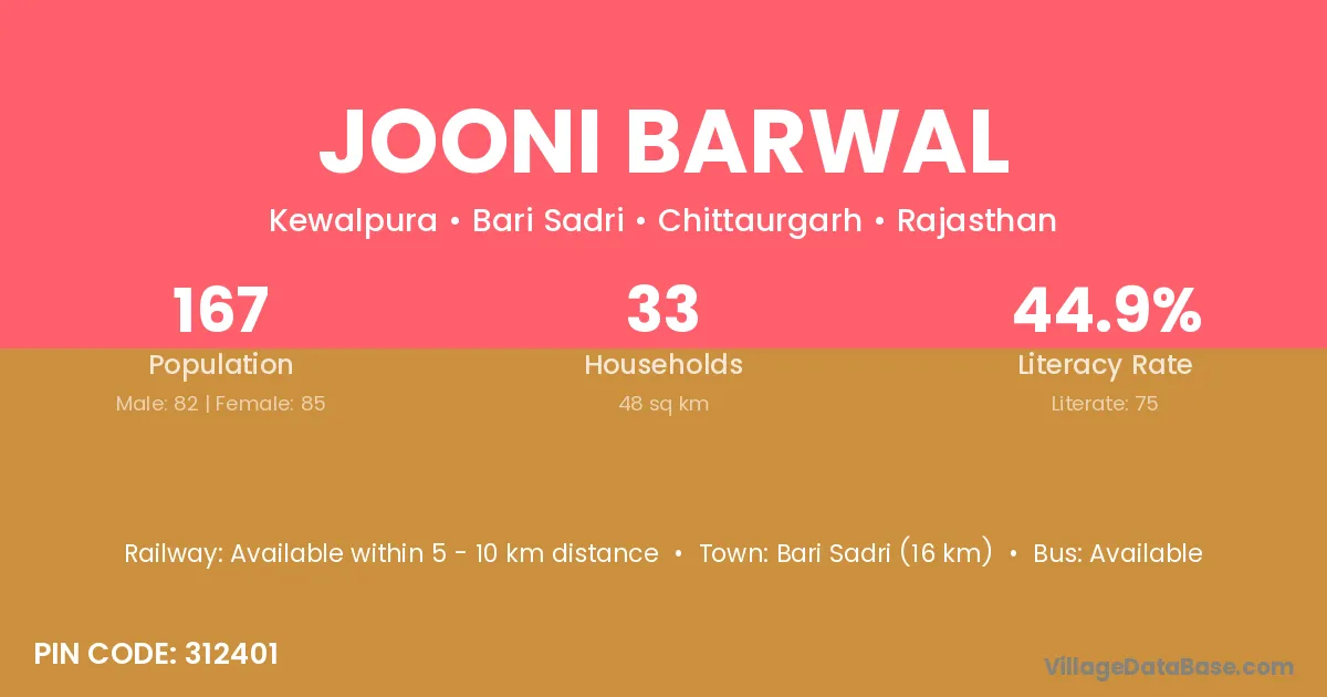 Bari Sadri (16 km) is the nearest town to Jooni Barwal village for major economic activities and is located approximately 16 km away.