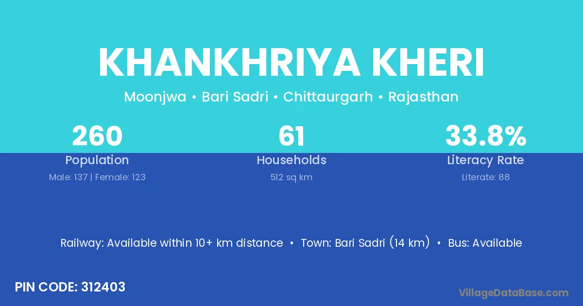 Bari Sadri (14 km) is the nearest town to Khankhriya Kheri village for major economic activities and is located approximately 14 km away.