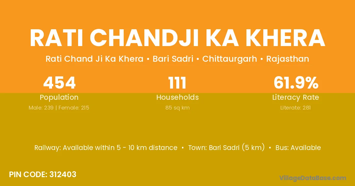 Rati Chandji Ka Khera village has a total population of 454 people, of which 239 are males and 215 are females.