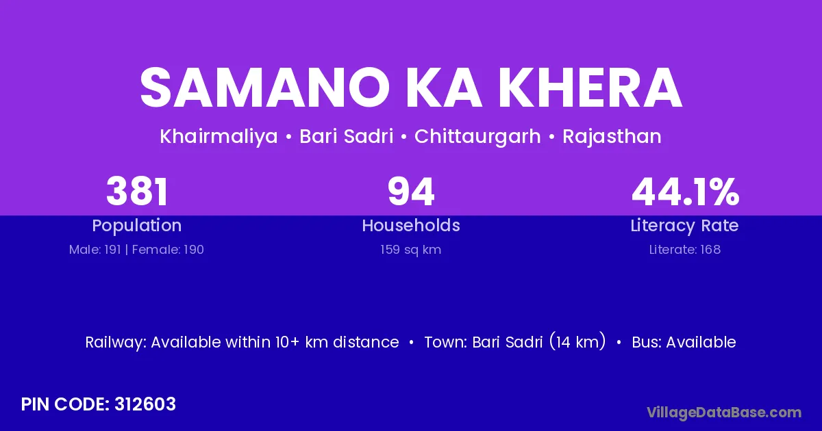 Samano Ka Khera village has a total population of 381 people, of which 191 are males and 190 are females.