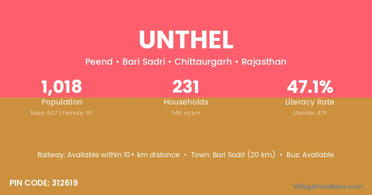 Bari Sadri (20 km) is the nearest town to Unthel village for major economic activities and is located approximately 20 km away.