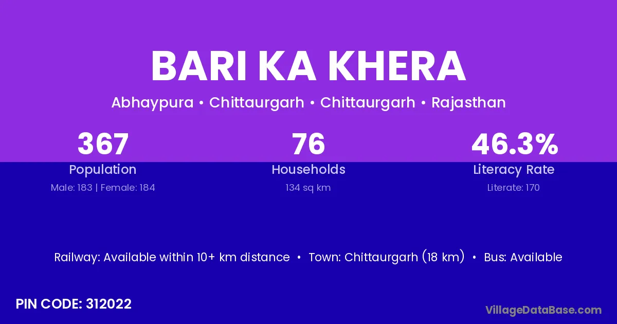Begun (18 km) is the nearest town to Bari Ka Khera village for major economic activities and is located approximately 18 km away.