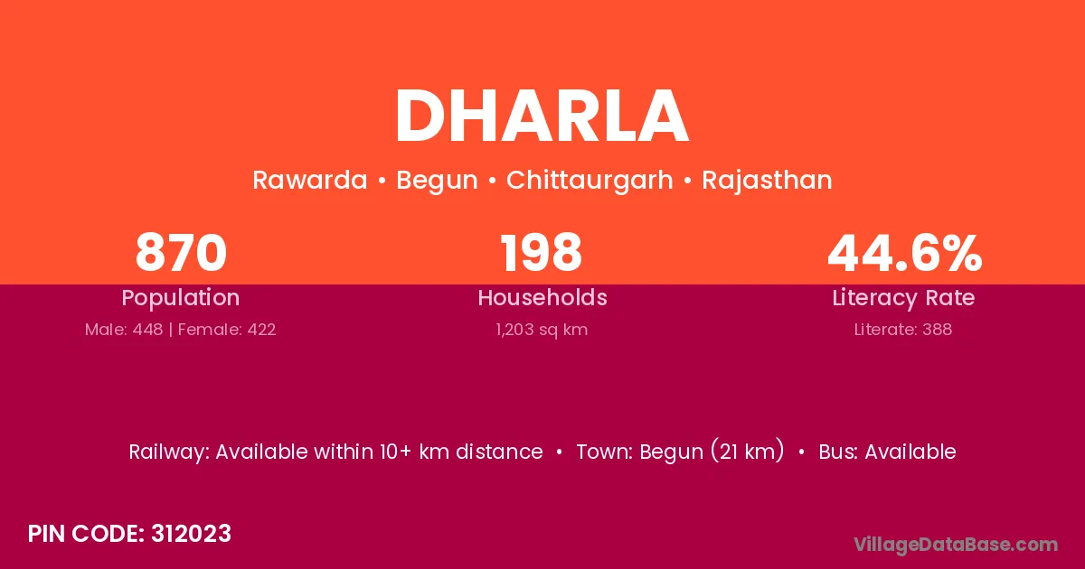 Dharla village has a total population of 870 people, of which 448 are males and 422 are females.