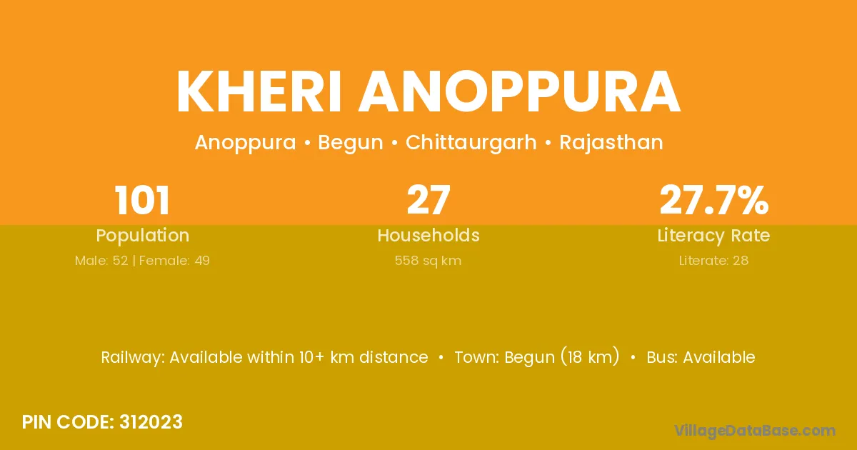 Begun (18 km) is the nearest town to Kheri Anoppura village for major economic activities and is located approximately 18 km away.