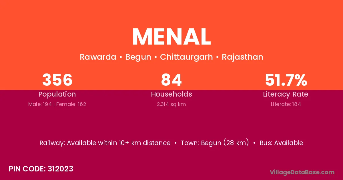 Begun (28 km) is the nearest town to Menal village for major economic activities and is located approximately 28 km away.