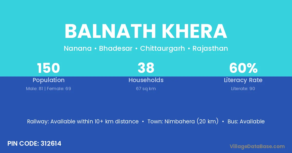 Nimbahera (20 km) is the nearest town to Balnath Khera village for major economic activities and is located approximately 20 km away.