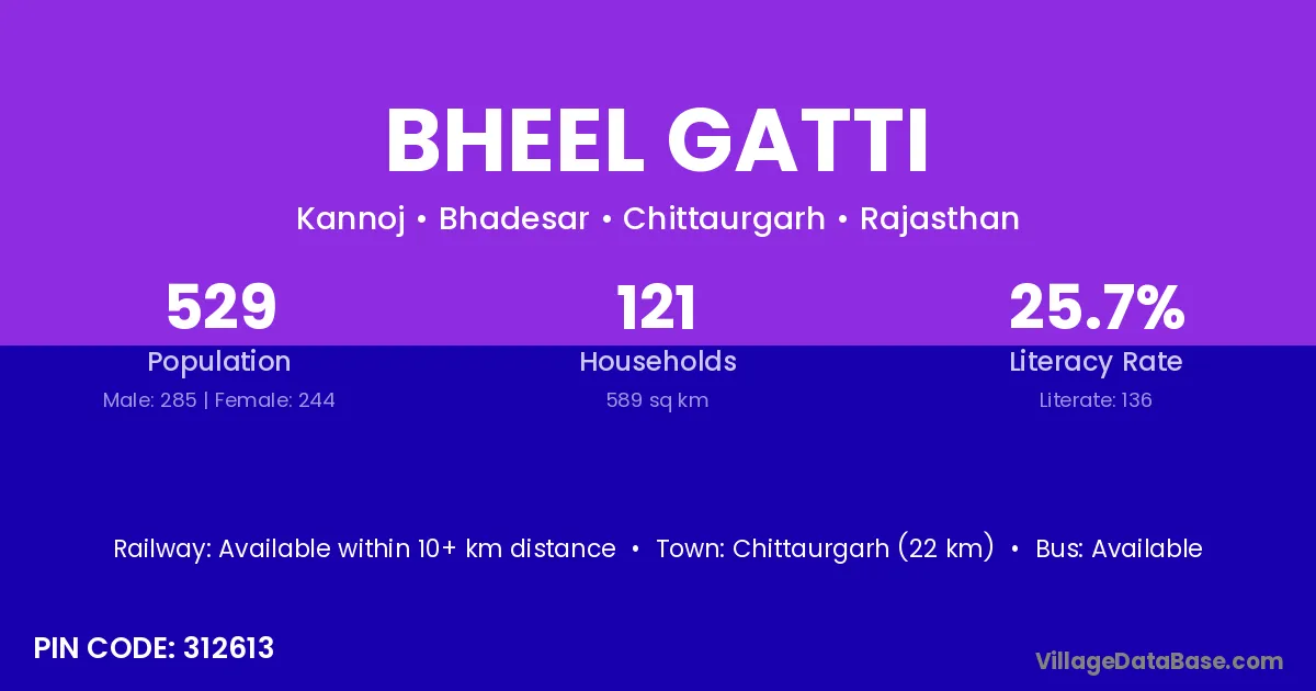 Chittaurgarh (22 km) is the nearest town to Bheel Gatti village for major economic activities and is located approximately 22 km away.