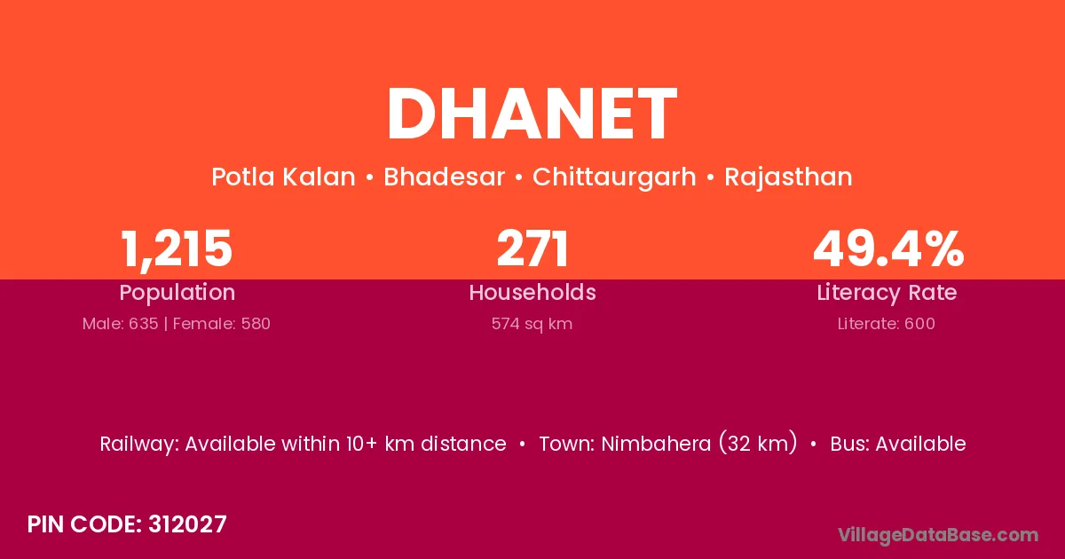 Nimbahera (32 km) is the nearest town to Dhanet village for major economic activities and is located approximately 32 km away.