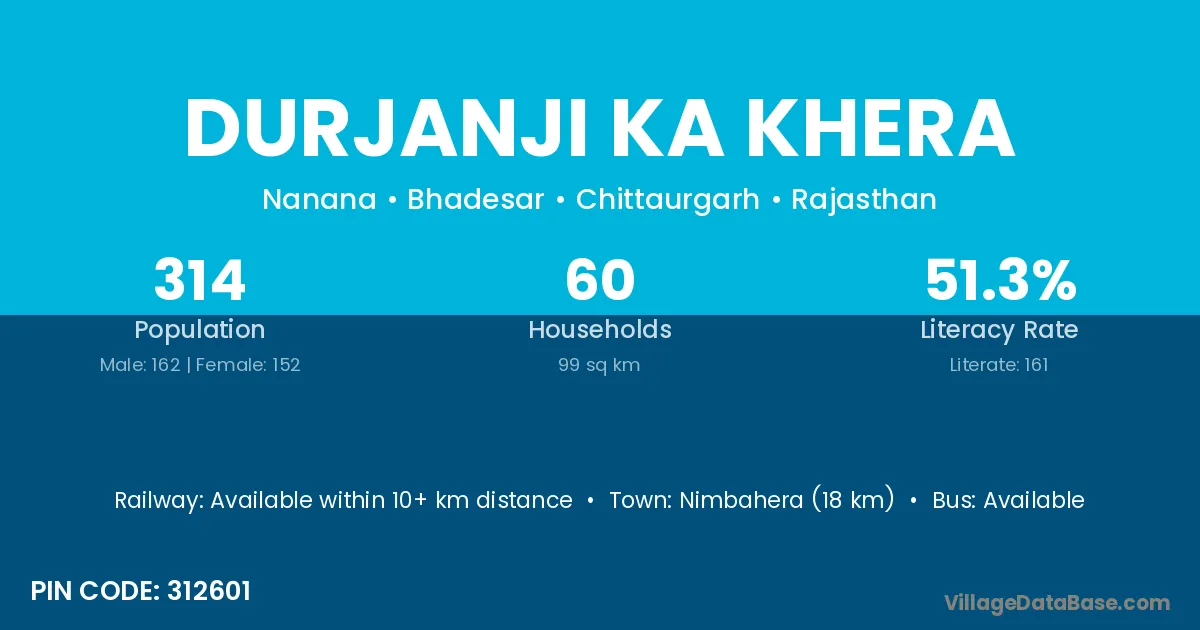 Nimbahera (18 km) is the nearest town to Durjanji Ka Khera village for major economic activities and is located approximately 18 km away.