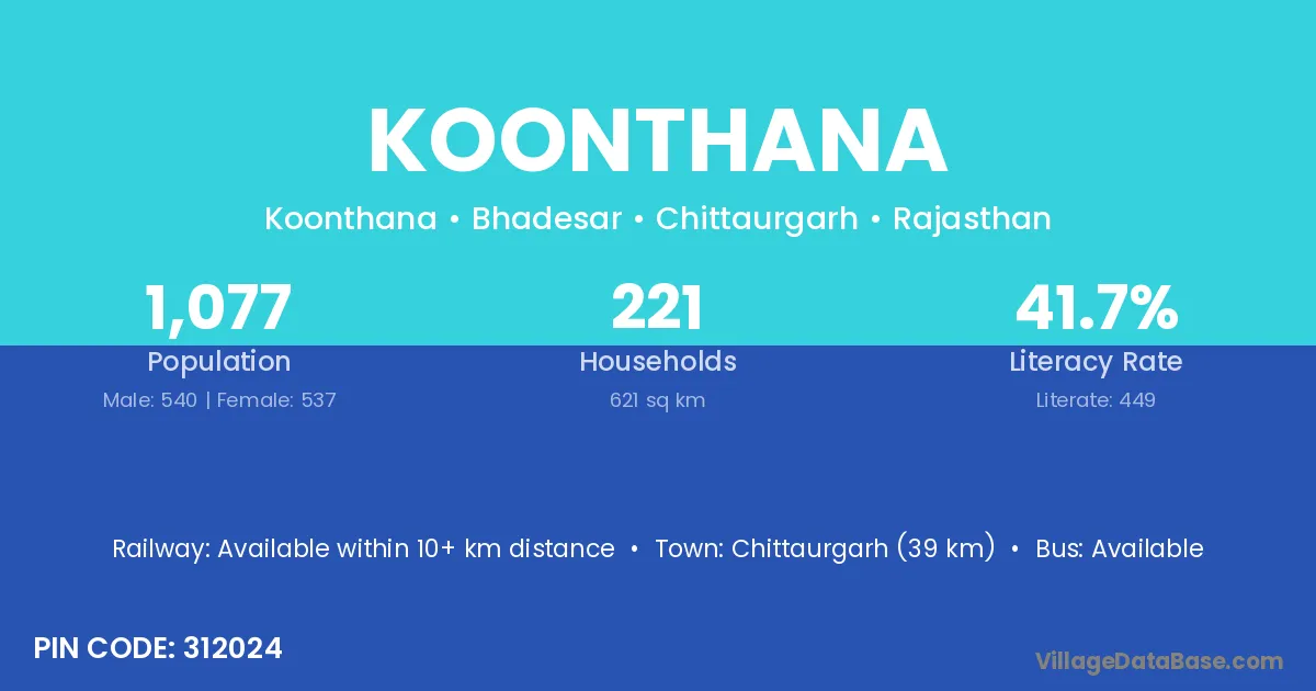 Koonthana village has a total population of 1,077 people, of which 540 are males and 537 are females.