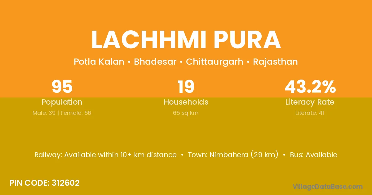 Nimbahera (29 km) is the nearest town to Lachhmi Pura village for major economic activities and is located approximately 29 km away.