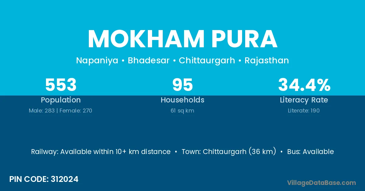 Chittaurgarh (36 km) is the nearest town to Mokham Pura village for major economic activities and is located approximately 36 km away.