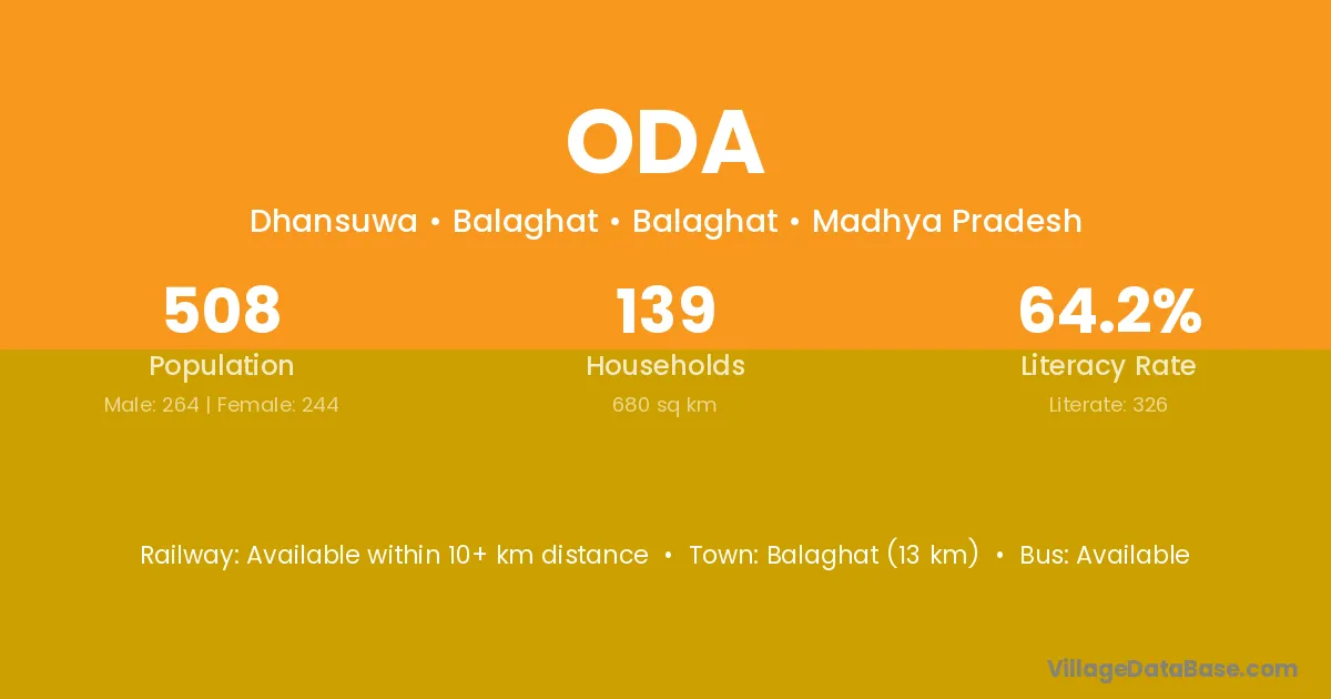 The literacy rate of Oda village is 46.88%. Male literacy stands at 56.25% and female literacy at 37.50%.