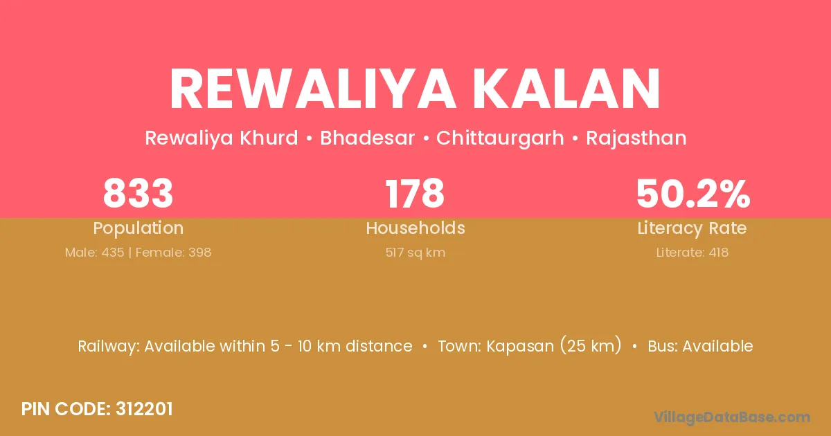 Kapasan (25 km) is the nearest town to Rewaliya Kalan village for major economic activities and is located approximately 25 km away.