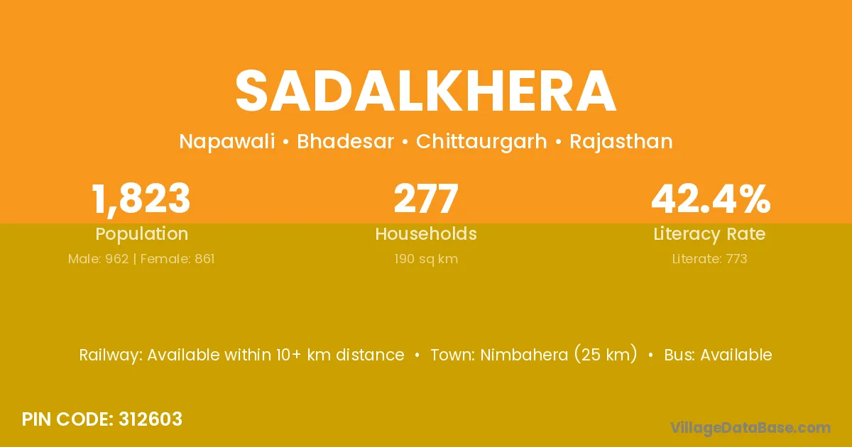 Nimbahera (25 km) is the nearest town to Sadalkhera village for major economic activities and is located approximately 25 km away.
