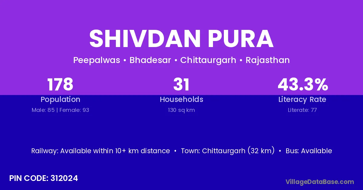 Chittaurgarh (32 km) is the nearest town to Shivdan Pura village for major economic activities and is located approximately 32 km away.