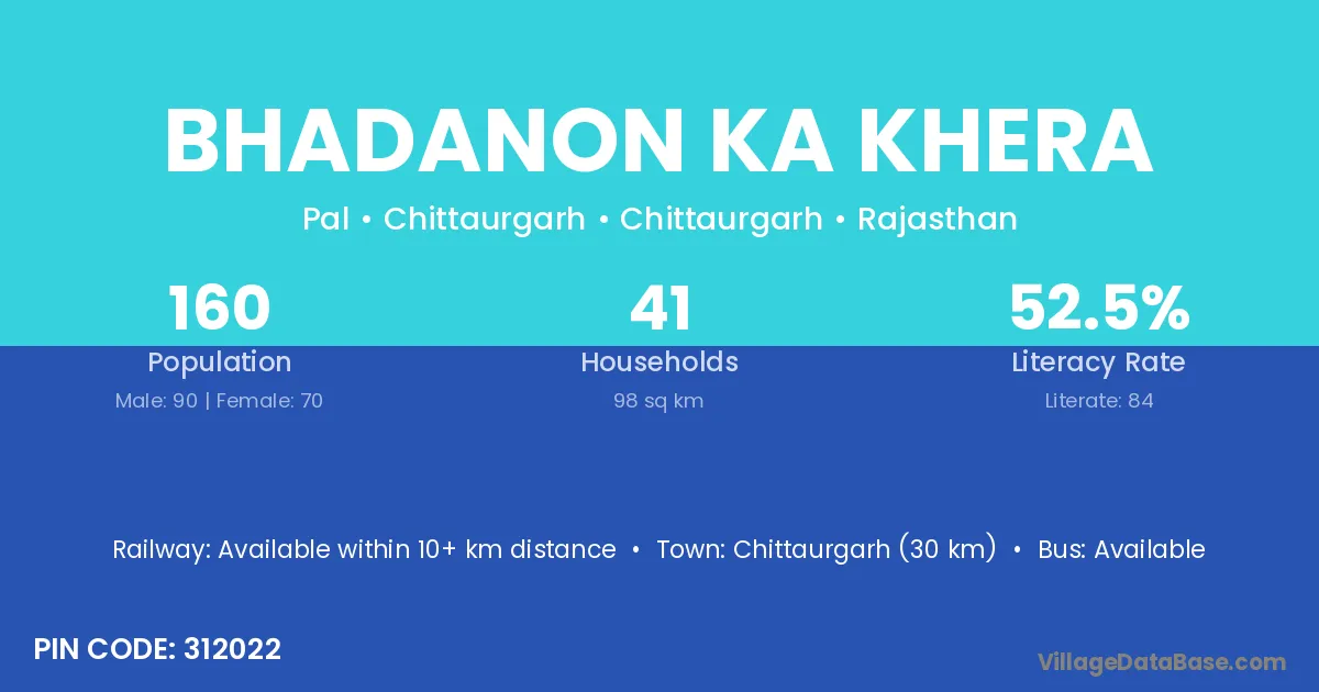 Chittaurgarh (30 km) is the nearest town to Bhadanon Ka Khera village for major economic activities and is located approximately 30 km away.