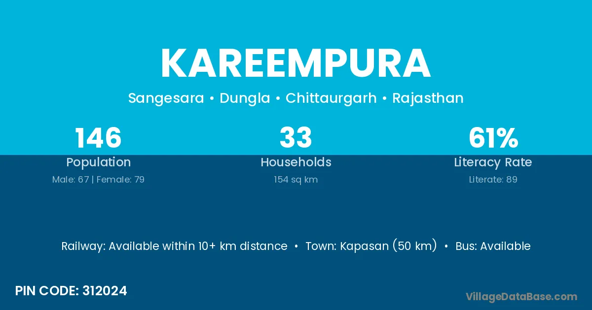 Kapasan (50 km) is the nearest town to Kareempura village for major economic activities and is located approximately 50 km away.