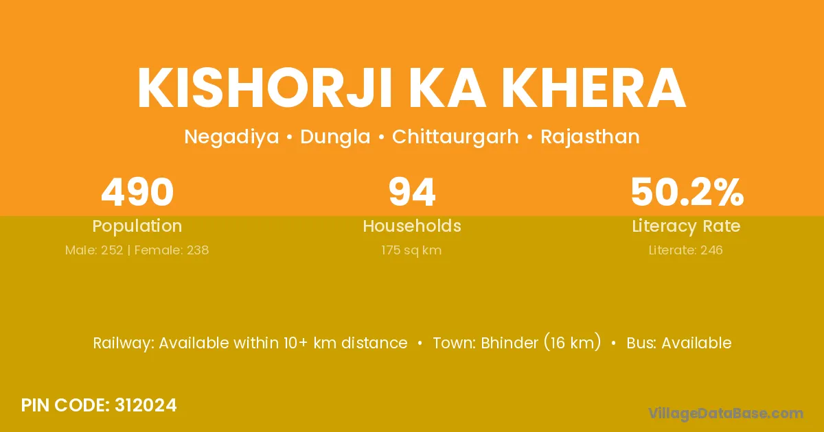 Kishorji Ka Khera village has a total population of 490 people, of which 252 are males and 238 are females.
