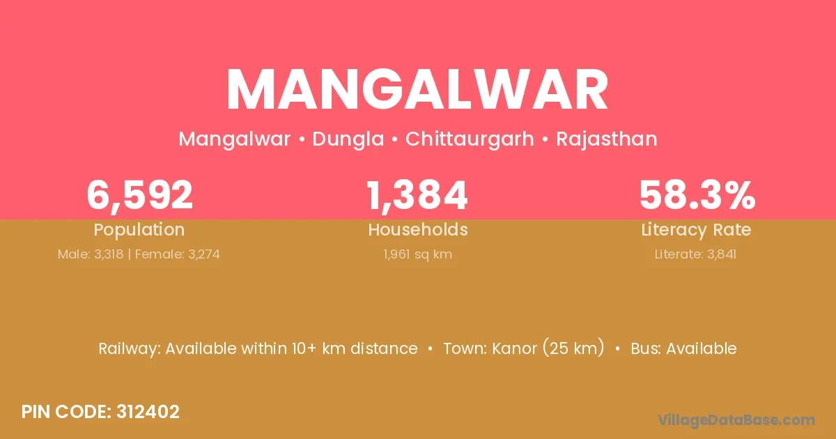 Mangalwar village has a total population of 6,592 people, of which 3,318 are males and 3,274 are females.