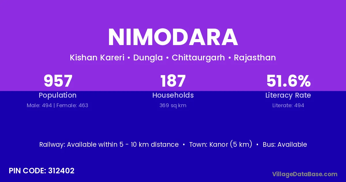 Kanor (5 km) is the nearest town to Nimodara village for major economic activities and is located approximately 5 km away.