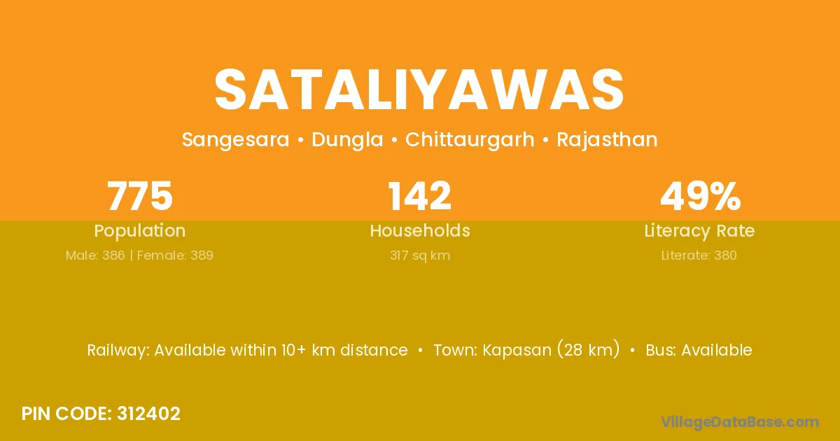 Kapasan (28 km) is the nearest town to Sataliyawas village for major economic activities and is located approximately 28 km away.