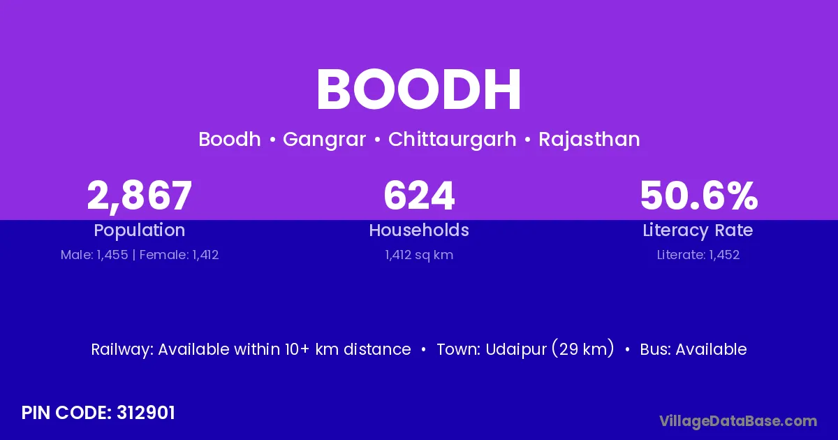 Udaipur (29 km) is the nearest town to Boodh village for major economic activities and is located approximately 29 km away.