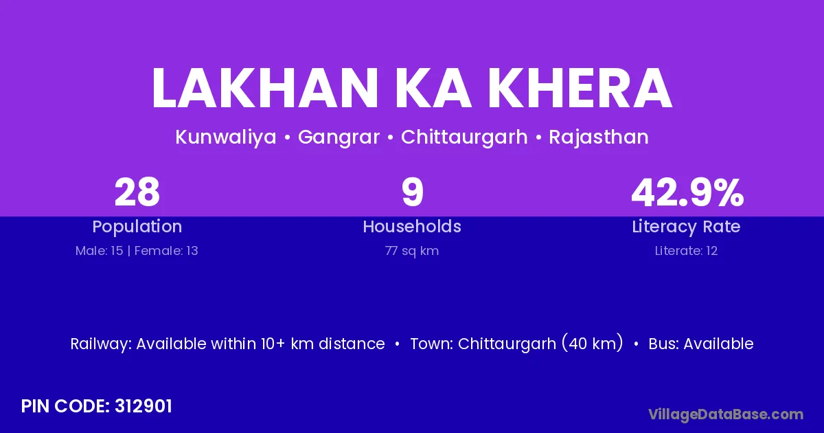 Lakhan Ka Khera village has a total population of 28 people, of which 15 are males and 13 are females.