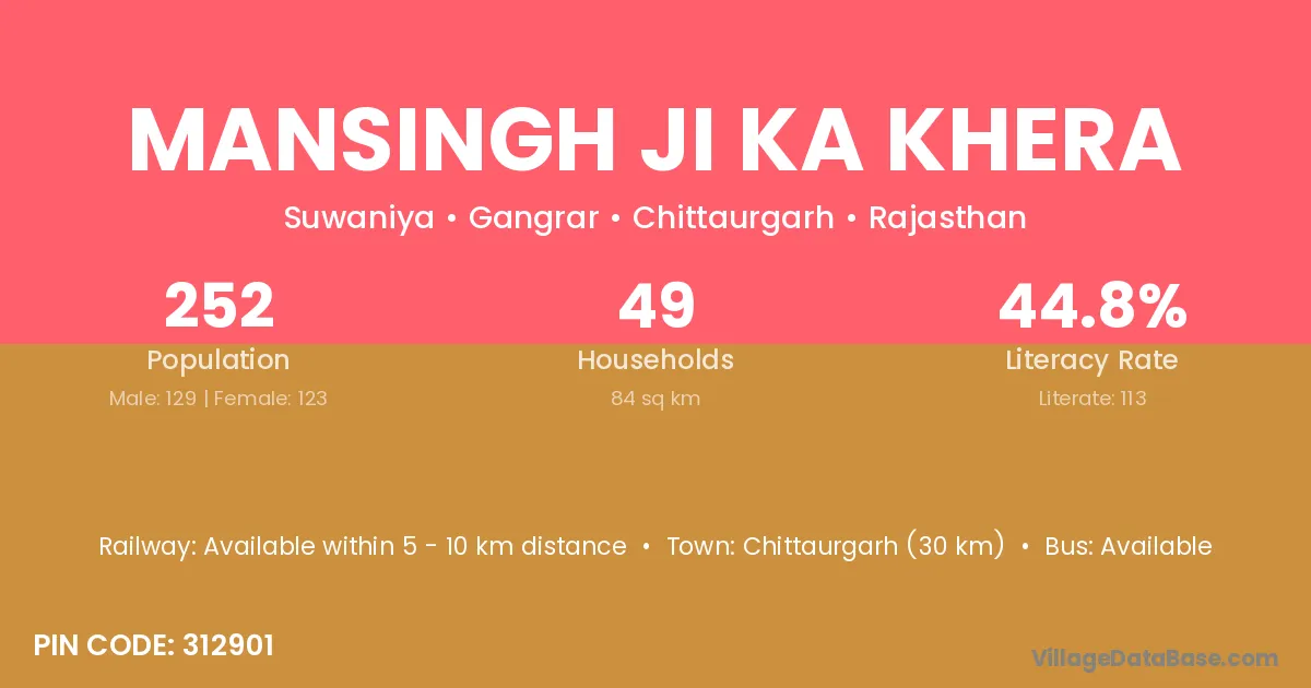 Mansingh Ji Ka Khera village has a total population of 252 people, of which 129 are males and 123 are females.
