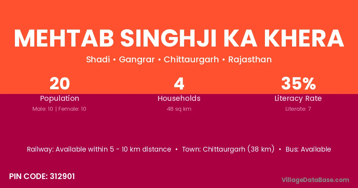 Mehtab Singhji Ka Khera village has a total population of 20 people, of which 10 are males and 10 are females.