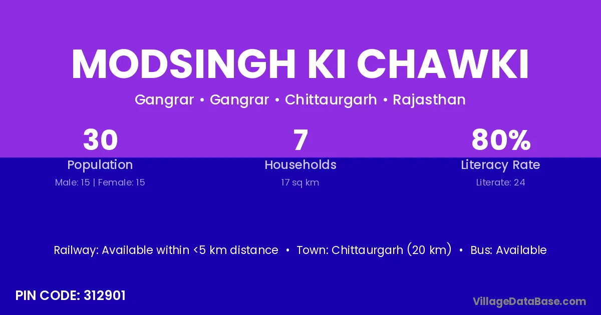 Modsingh Ki Chawki village has a total population of 30 people, of which 15 are males and 15 are females.