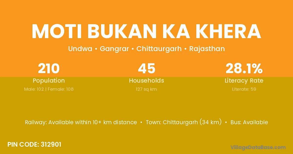 Moti Bukan Ka Khera village has a total population of 210 people, of which 102 are males and 108 are females.