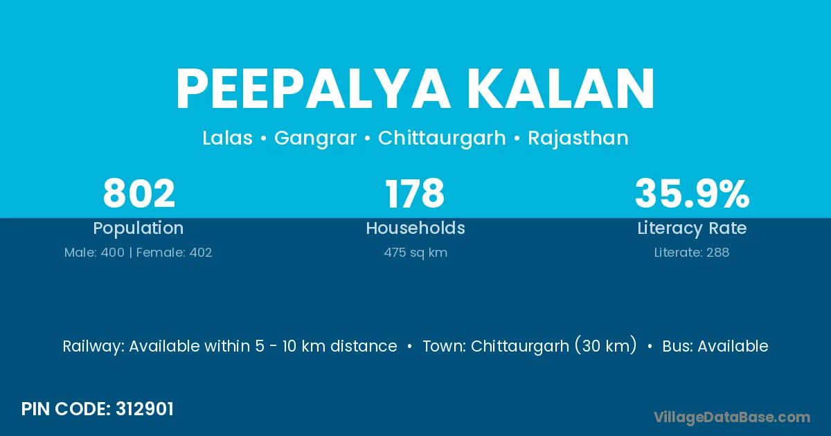 Chittaurgarh (30 km) is the nearest town to Peepalya Kalan village for major economic activities and is located approximately 30 km away.