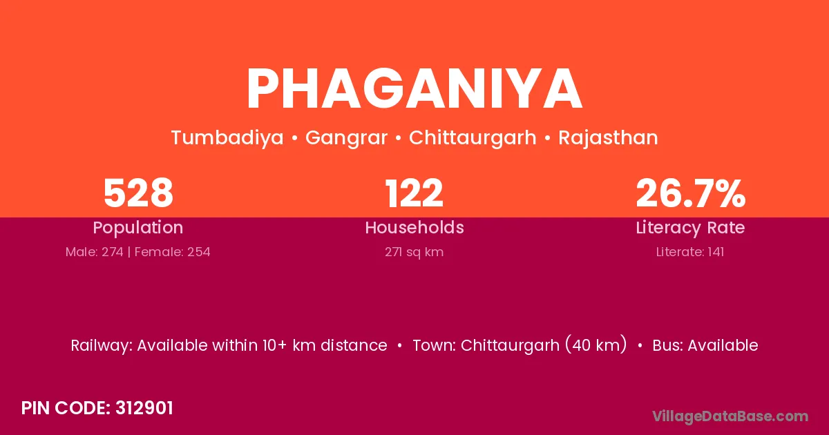 Chittaurgarh (40 km) is the nearest town to Phaganiya village for major economic activities and is located approximately 40 km away.