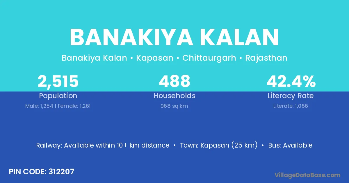 Kapasan (25 km) is the nearest town to Banakiya Kalan village for major economic activities and is located approximately 25 km away.