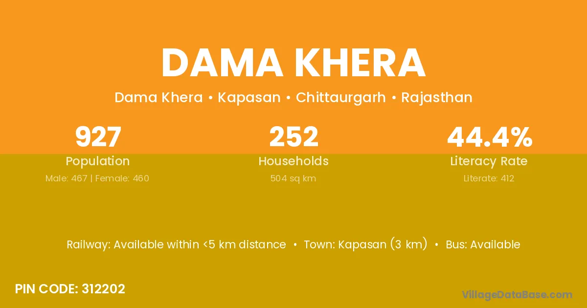 Kapasan (3 km) is the nearest town to Dama Khera village for major economic activities and is located approximately 3 km away.