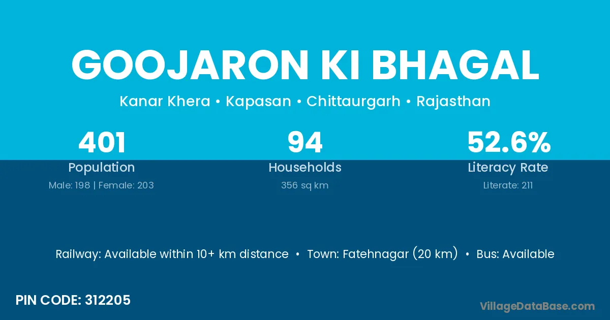 Goojaron Ki Bhagal village has a total population of 401 people, of which 198 are males and 203 are females.