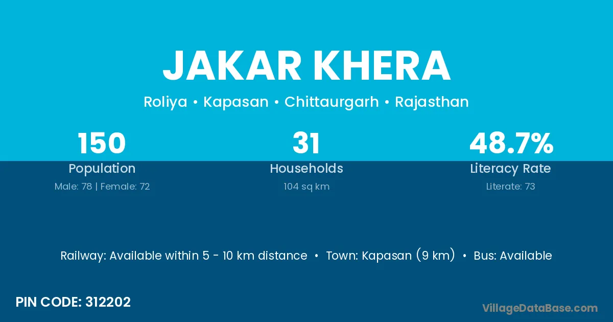 Kapasan (9 km) is the nearest town to Jakar Khera village for major economic activities and is located approximately 9 km away.