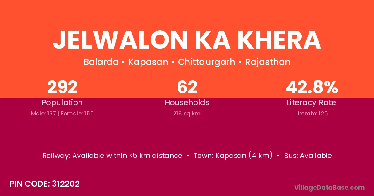Jelwalon Ka Khera village has a total population of 292 people, of which 137 are males and 155 are females.