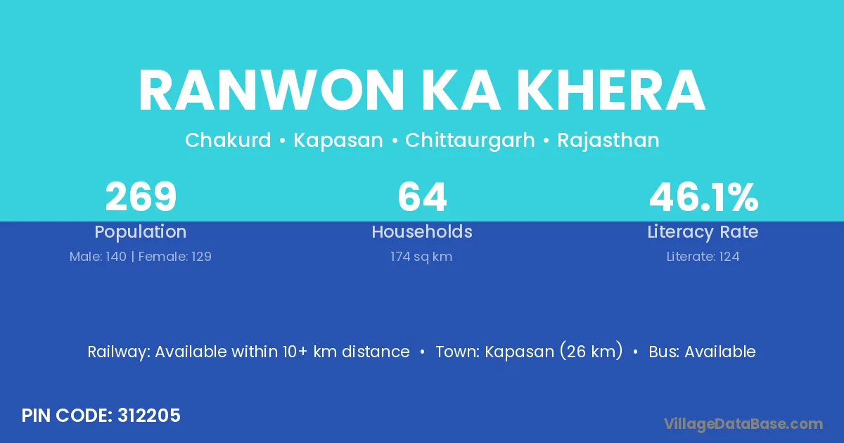 Kapasan (26 km) is the nearest town to Ranwon Ka Khera village for major economic activities and is located approximately 26 km away.