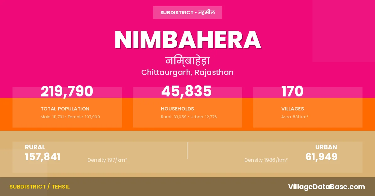 According to the 2011 census The total area of Nimbahera Tehsil is 831 km², with a population of 219790 people. The population density is 264 inhabitants per square kilometre, and there are approximately 45835 houses in the sub district.
