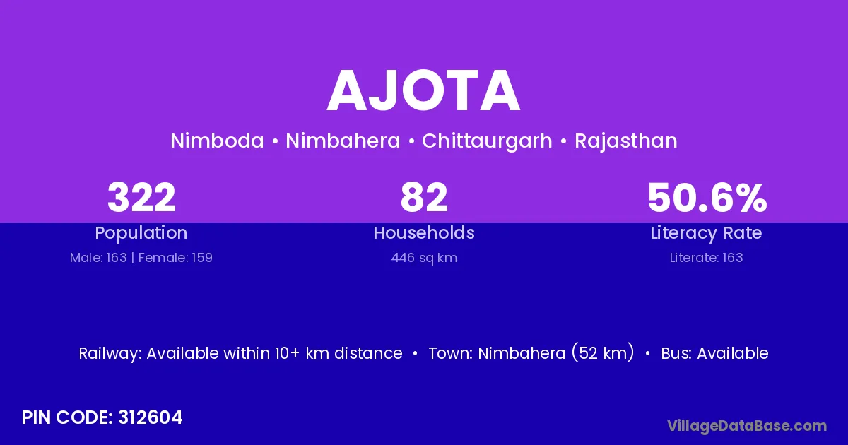 Nimbahera (52 km) is the nearest town to Ajota village for major economic activities and is located approximately 52 km away.