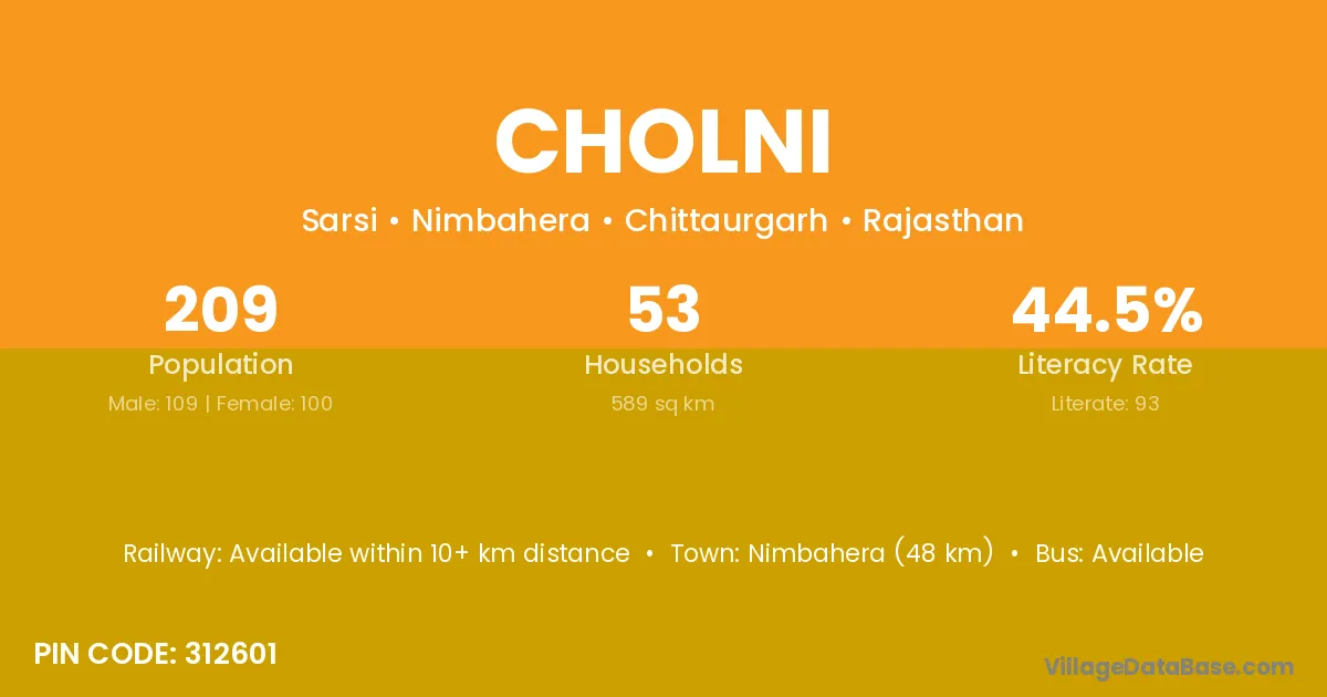 Nimbahera (48 km) is the nearest town to Cholni village for major economic activities and is located approximately 48 km away.