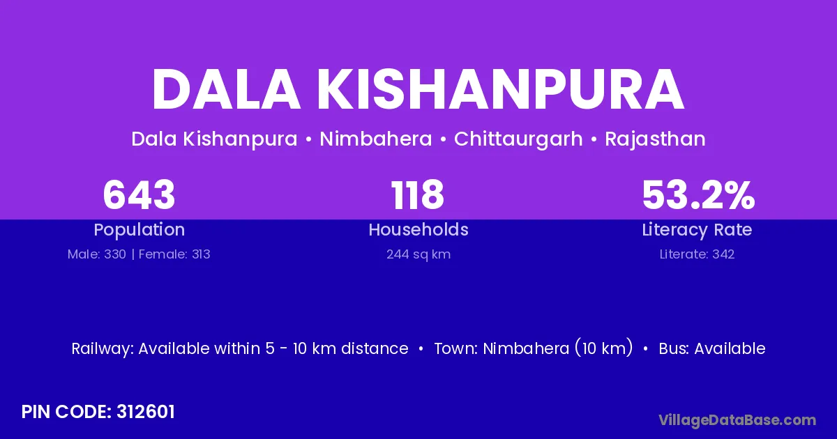 Nimbahera (10 km) is the nearest town to Dala Kishanpura village for major economic activities and is located approximately 10 km away.