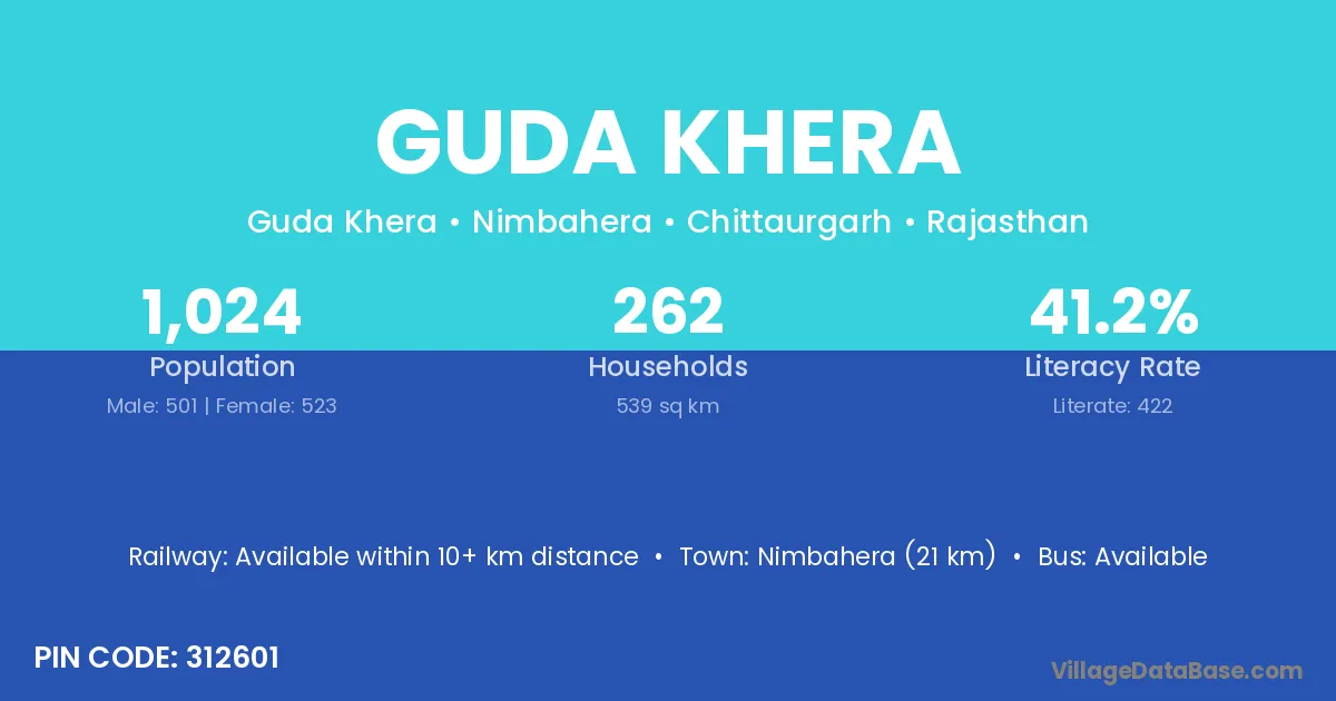 Nimbahera (21 km) is the nearest town to Guda Khera village for major economic activities and is located approximately 21 km away.