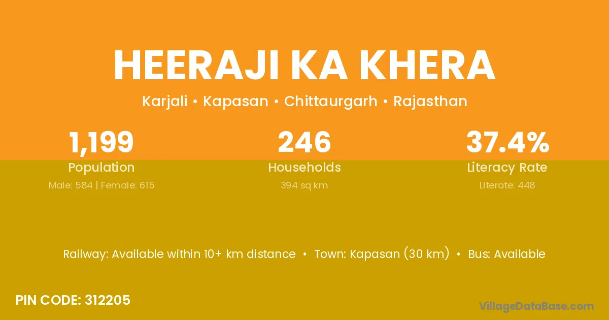 Nimbahera (50 km) is the nearest town to Heeraji Ka Khera village for major economic activities and is located approximately 50 km away.