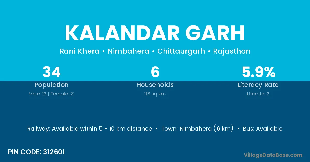 Nimbahera (6 km) is the nearest town to Kalandar Garh village for major economic activities and is located approximately 6 km away.