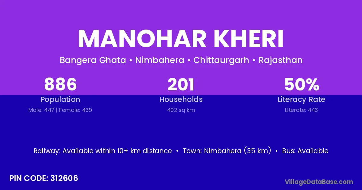 Nimbahera (35 km) is the nearest town to Manohar Kheri village for major economic activities and is located approximately 35 km away.