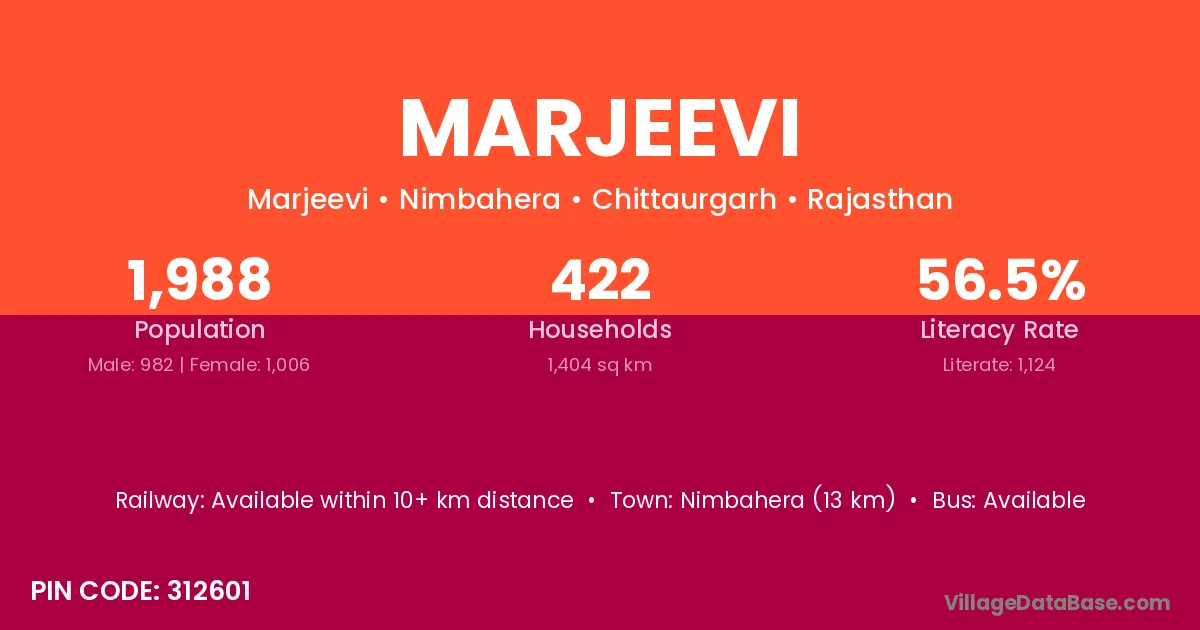 Nimbahera (13 km) is the nearest town to Marjeevi village for major economic activities and is located approximately 13 km away.